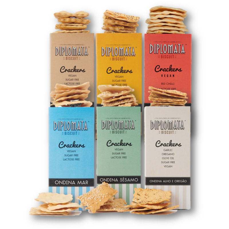 Encontra as crackers salgadas da Diplomata em 6 variedades originais: Ondina Mar, Ondina Sésamo, Ondina Alho e Orégãos, Sete Folhas, Capinhas Papoila e mais recentemente, Ondina Malagueta. Combine-as com o seu cabaz favorito, como o cabaz Tábua de Queijos ou adquira-as individualmente para acompanhar uns cogumelos ou umas sardinhas picantes.